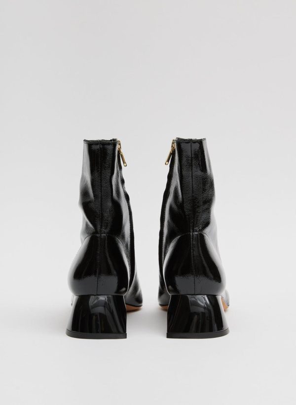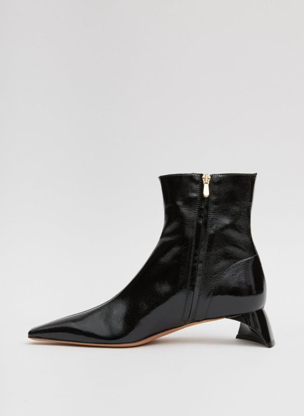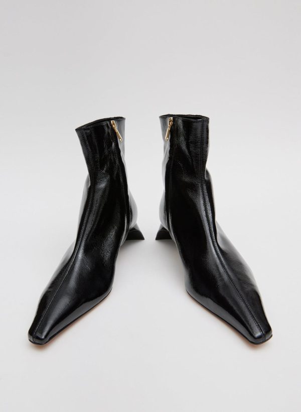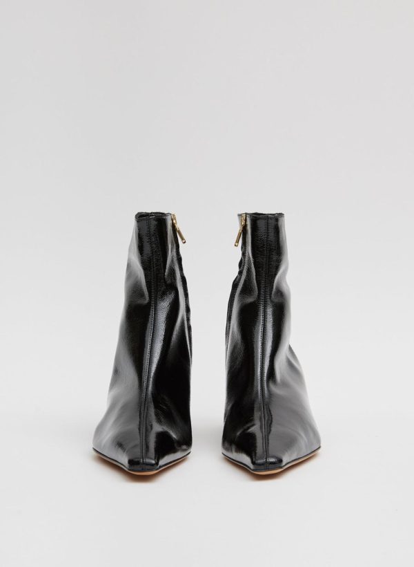 While booties are not a frequent footwear silhouette that the Creative Pragmatist reaches for, when the shape feels modern, functional, and elegant all at once, the timing feels right. Produced in 100% lamb leather featuring an ultra-shiny patent finish with a semi-shiny, sculptural heel—exclusive to Tibi—this style effortlessly embraces a wide range of textiles, pairing easy to classic silhouettes and novelty options alike.