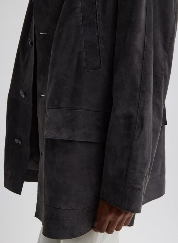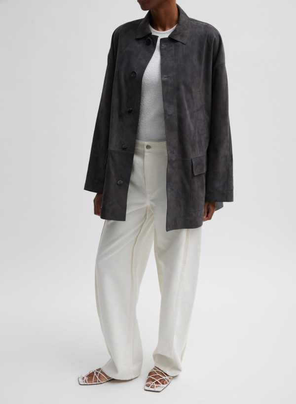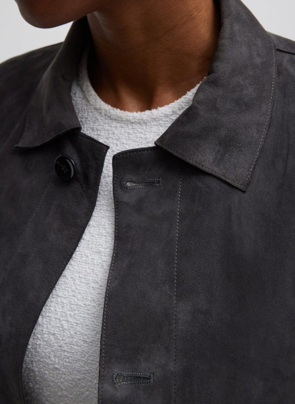 Introducing the Cassiterite Suede Leather Carcoat, crafted from a Superfine Lamb Suede sourced from Turkey, making it your ideal companion for everyday wear this season. Designed with a perfect balance of style and practicality, this jacket features multiple pockets, secure button closures, and a luxe suede fabrication that effortlessly transitions between dressy and casual occasions. For a put-together everyday look this Spring, pair back to the Boucle Knit Long Sleeve Circular Top in White and the Tuck Jean in White. Finish off the look with a strappy white sandal.