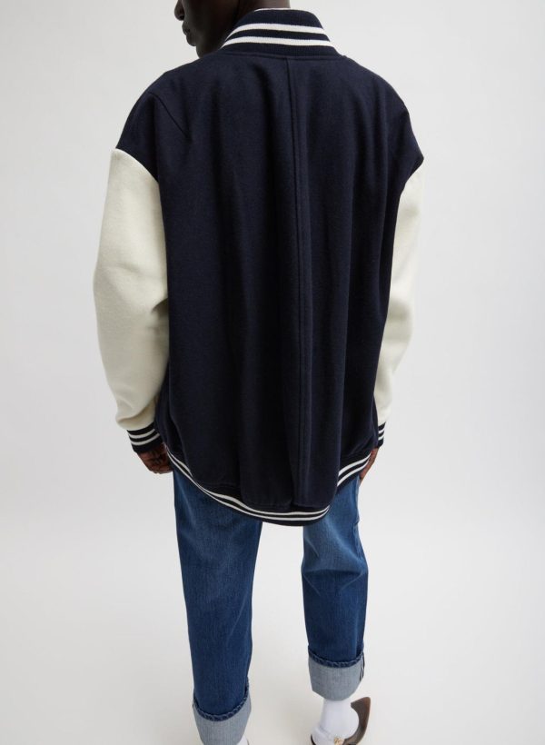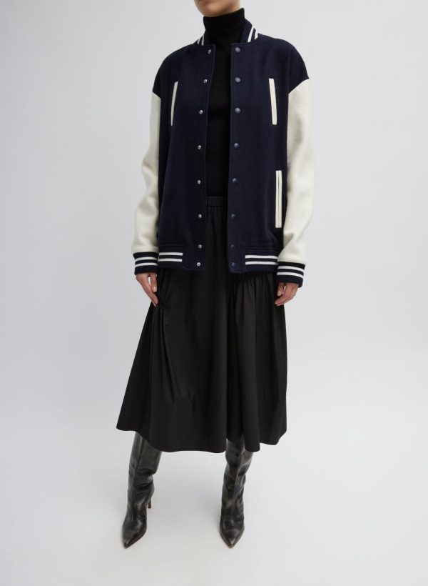 The Felted Wool Cocoon Varsity Bomber Jacket is the kind of modern adaptation of a classic style that the Creative Pragmatist craves. Bringing you the comfort and ease of a vintage varsity jacket—sturdy, well-worn and purposefully oversized. Featuring snap closure detailing up the front, oversized pockets, and a sporty yet classic design for optimal styling. The unsung hero of your wardrobe now…and forever, this jacket will never spend much time on the hanger and take you to all your weekend plans this season. Pair back to a Perfect T and the Alec Slouch Jean for a balanced look.