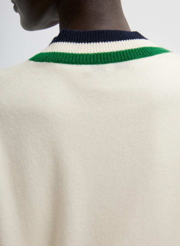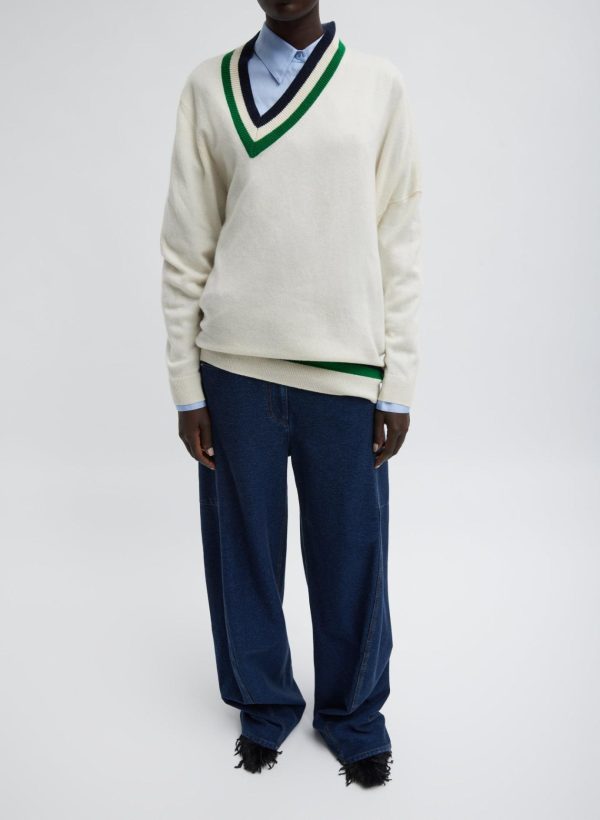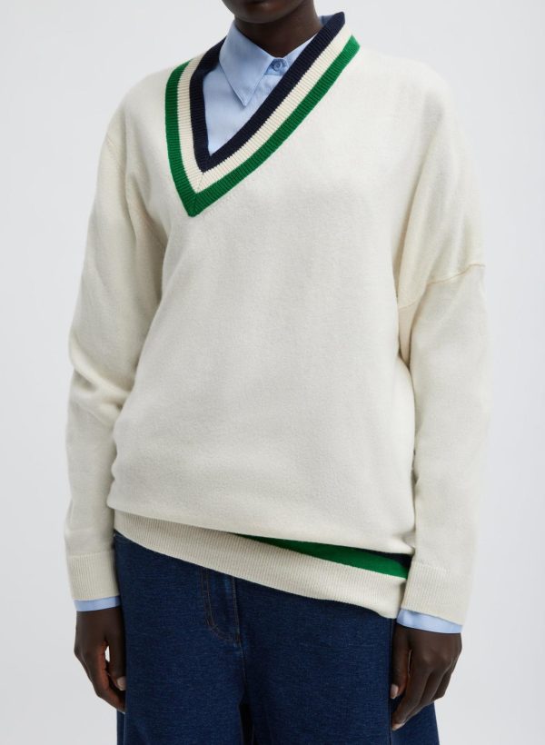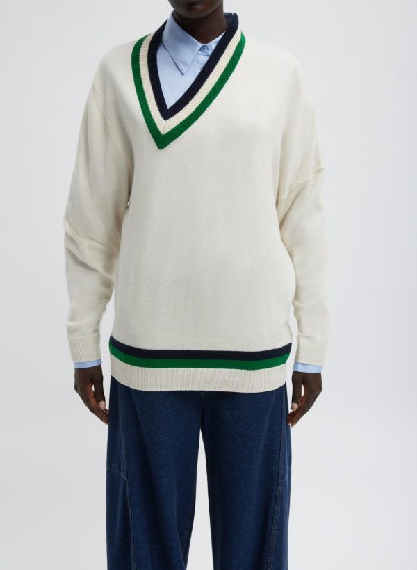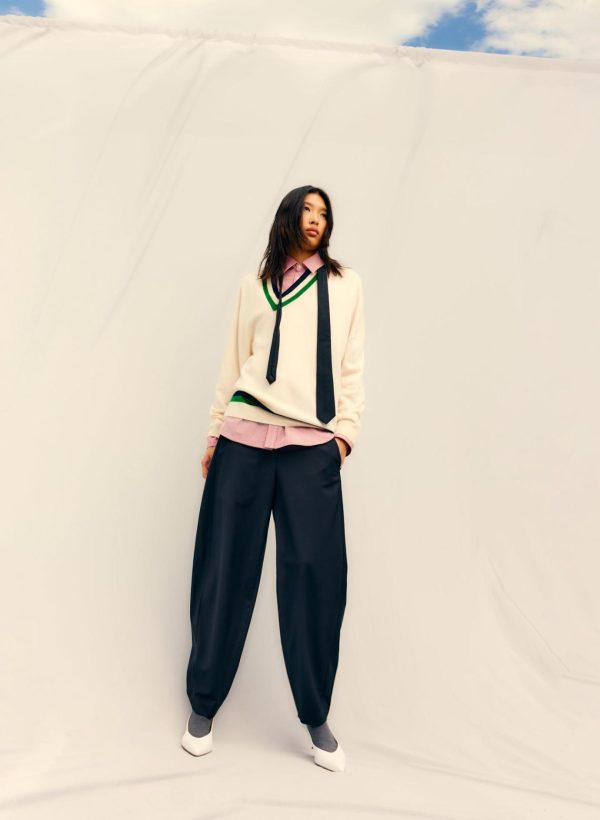 The Washable Cashmere Striped Warp V-Neck Pullover combines luxury with practicality in a striking striped design. An ideal base layer or standalone piece, it adds a touch of effortless chic to any look, perfect for evenings or casual day outings alike.
