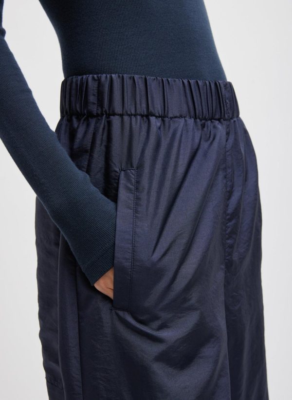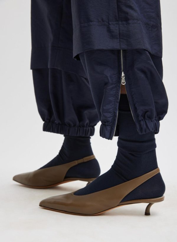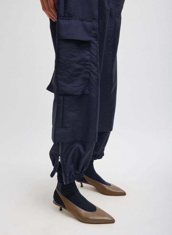 This assortment serves as your WOFs (Without Fails) and are designed to create space in your wardrobe for creativity and experimentation. No matter how extreme your closet may become, these pieces serve as the grounding element that ties everything together. The crispy nylon pull on Wilt jogger quickly became a fan favorite for the creative pragmatist. The pull-on elasticized waist, functional side cargo pockets, side zippers, and the chic flap detail on the shin. Made in a nylon blend, these pants possess the relaxed elegance needed to transition from the grocery store to the office, to evening with the right shoes. This is the ultimate PDW for customers who are continuing to build out their ideal wardrobe. For a chic seasonal transition look, tuck your pants into a shaft boot and pair with a cashmere sweater.
