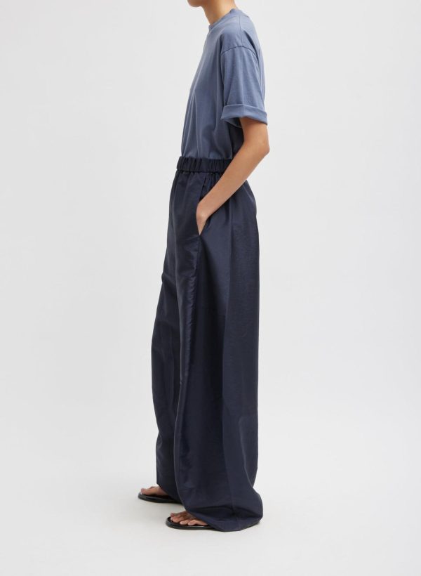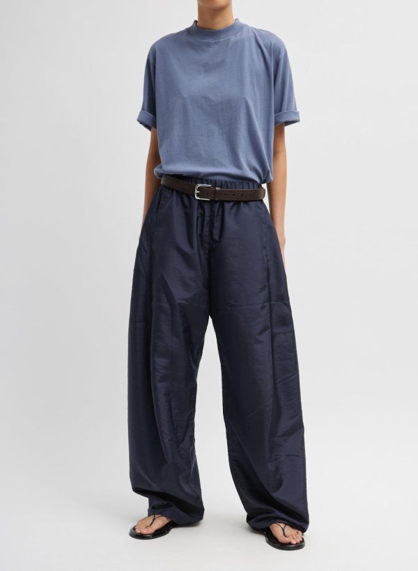 Featuring hem snaps for temporary alterations, the Crispy Nylon Winslow Pant offers pragmatic design with elevated details. Its Italian nylon fabrication comes in Black, Navy, and Red, making it a standout option for creative and pragmatic outfitting. Pair back to the matching Liam blazer for a full power suit or pair back to the Circular Fine rib group for a chill take on this pull on pant.