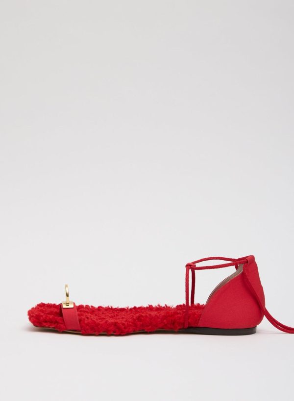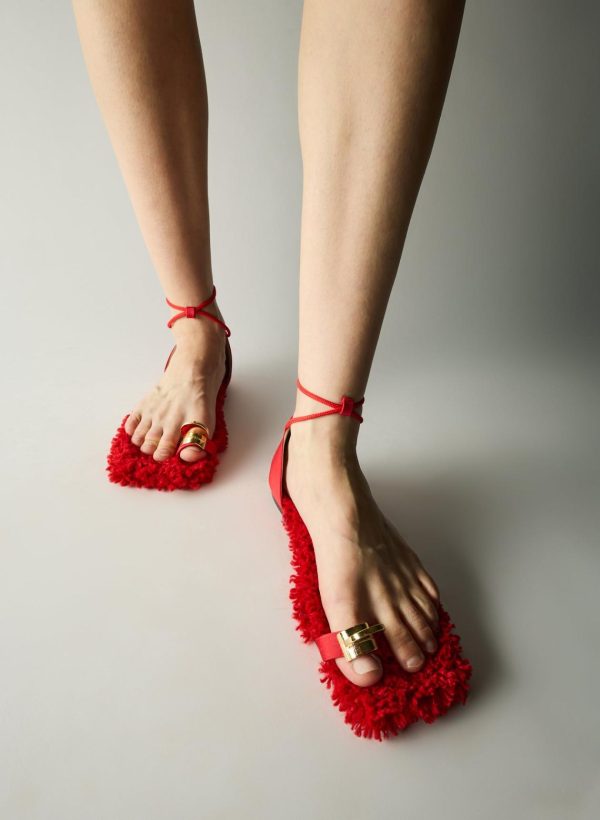 Introducing the Jack Sandal, a playful toe ring design that features durable laces and a cozy, fuzzy sole—your go-to choice for an eye-catching statement. Available in striking Black with silver accents or vibrant Red with gold accents, this sandal prioritizes comfort without compromising style. While functionality is key to Creative Pragmatism, we also celebrate pieces that bring joy and a reminder of our love for fashion. This season, let the Jack Sandal be your unsung footwear hero, effortlessly elevating any outfit with flair
