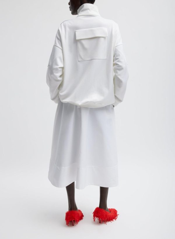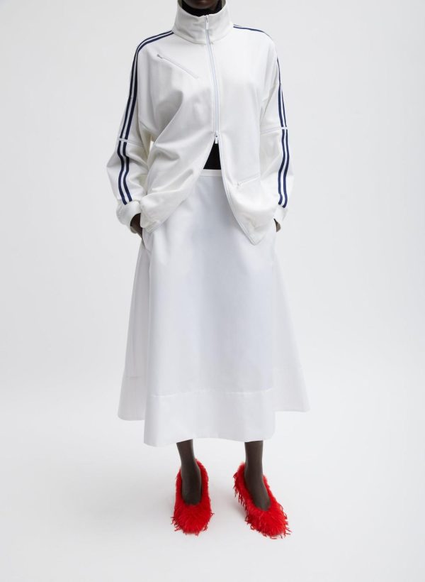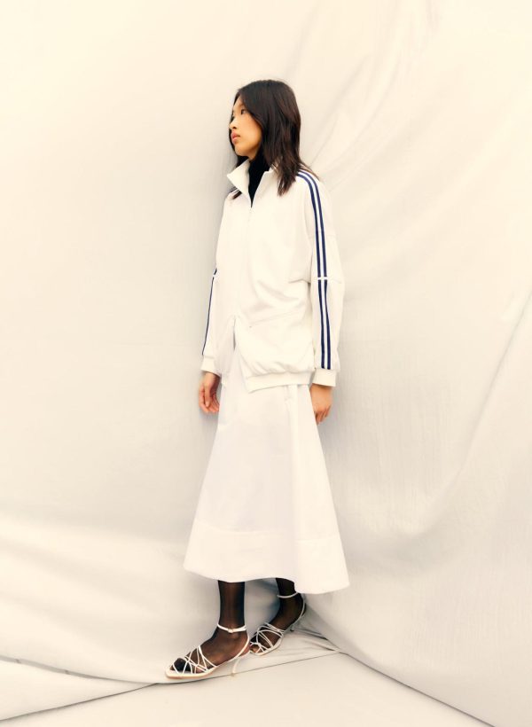The Eco Nylon Circle Skirt is both structured and airy, a piece that brings playful movement to your look. Available in Navy and White, this voluminous silhouette sits perfectly at the waist with a zipper and snap closure. Wear it with the Eco Poplin Hooded Shirt or pair with a cozy knit for a balance of structure and flow that embodies modern sophistication.